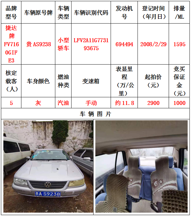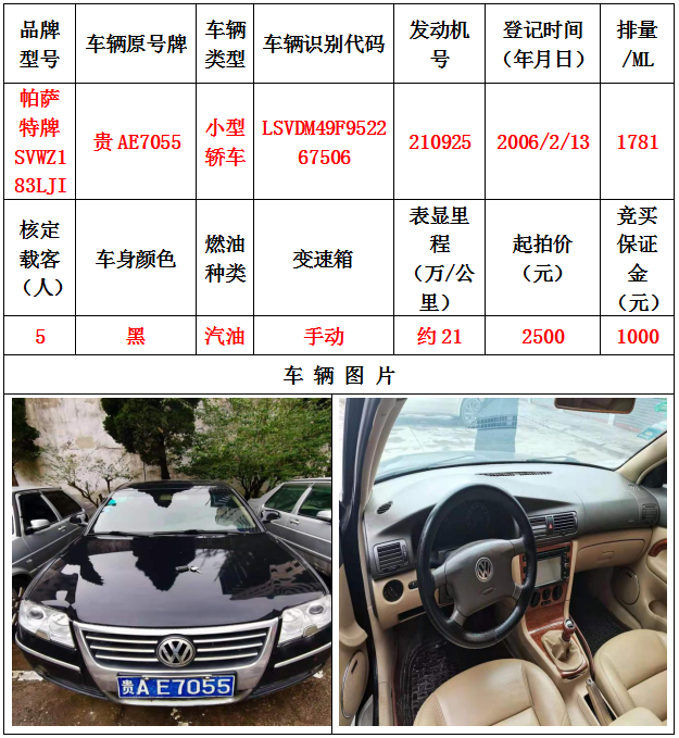 本次拍賣會拍賣的車輛共計(jì)10輛車,分別為帕薩特牌SVWZ183LJI小型轎車一輛、匯眾牌SH6530中型普通客車一輛、別克牌SGM6517小型普通客車一輛、別克牌SGM7161LE小型轎車一輛、寶來牌BORA1.6小型轎車一輛、捷達(dá)牌FV7160GiFE3小型轎車五輛(詳情見下文),為打包整體拍賣,不作拆分,整體起拍價(jià):33900元,且只對標(biāo)的現(xiàn)狀進(jìn)行拍賣,不作任何質(zhì)量擔(dān)保。