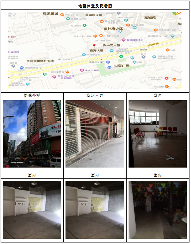 標(biāo)的位于貴陽市云巖區(qū)香獅路198、196號新里程商城1號樓F1層203號;該標(biāo)的分?jǐn)偼恋厥褂脵?quán)面積:98.51㎡ ,總建筑面積:285.72㎡,樓宇總層數(shù):9層,所在樓層:1層,地類用途:商業(yè)用地;土地使用權(quán)類型為出讓,土地使用權(quán)終止日期為:2053年10月23日,土地所有權(quán)為國家所有;建筑結(jié)構(gòu):混合結(jié)構(gòu);層高:3.3米,建筑用途為商住。