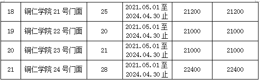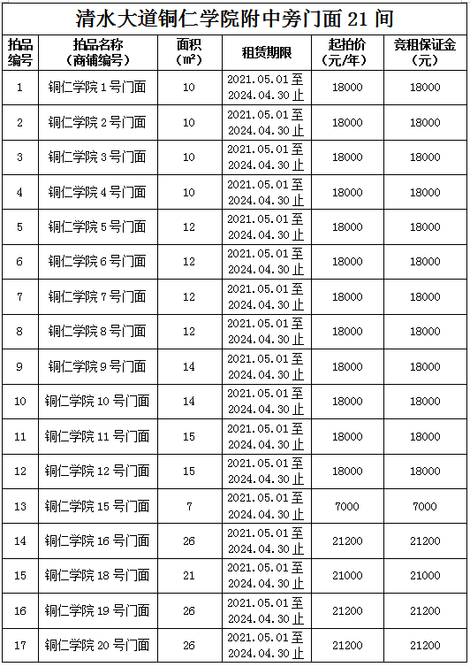 1.拍品1至21號標的位于銅仁市清水大道銅仁學(xué)院附中旁,面積7——28㎡,租賃期3年(2021.05.01至2024.04.30止),交通便利,人流量大。