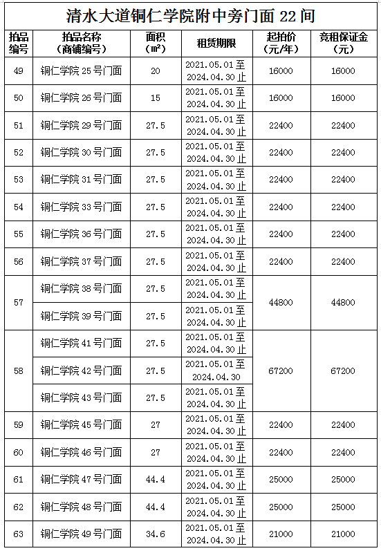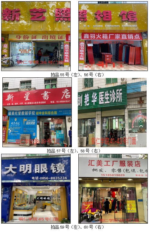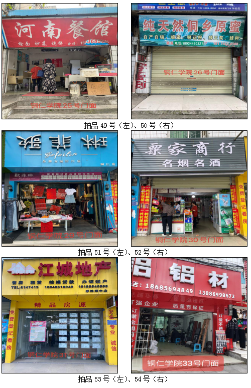 1.拍品49至66號標的位于銅仁市清水大道銅仁學(xué)院附中旁,面積15——44.4㎡,租賃期3年(2021.05.01至2024.04.30止),交通便利,人流量大。
