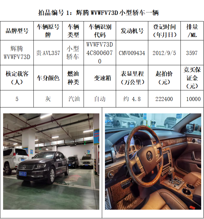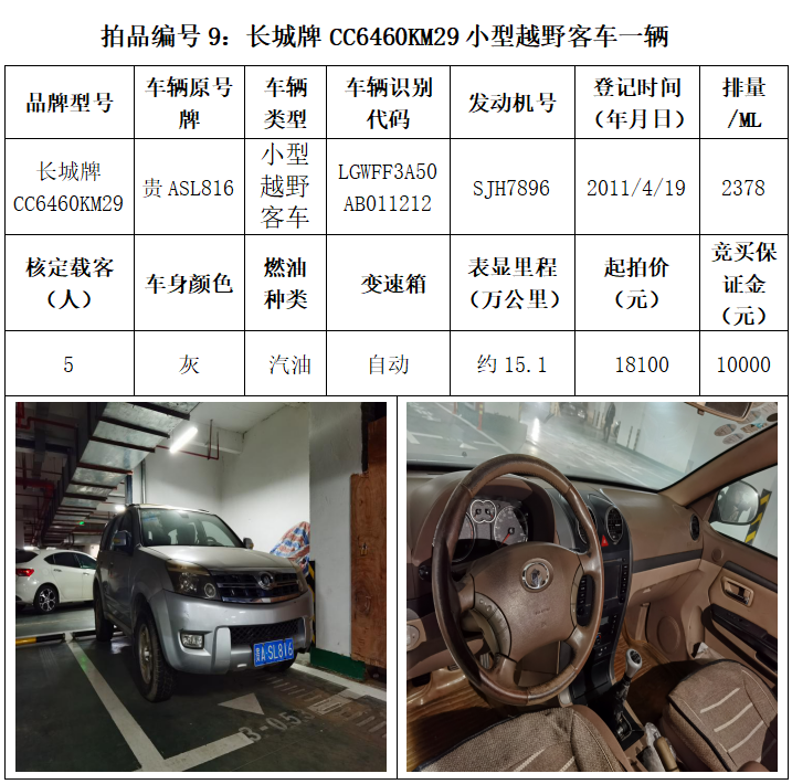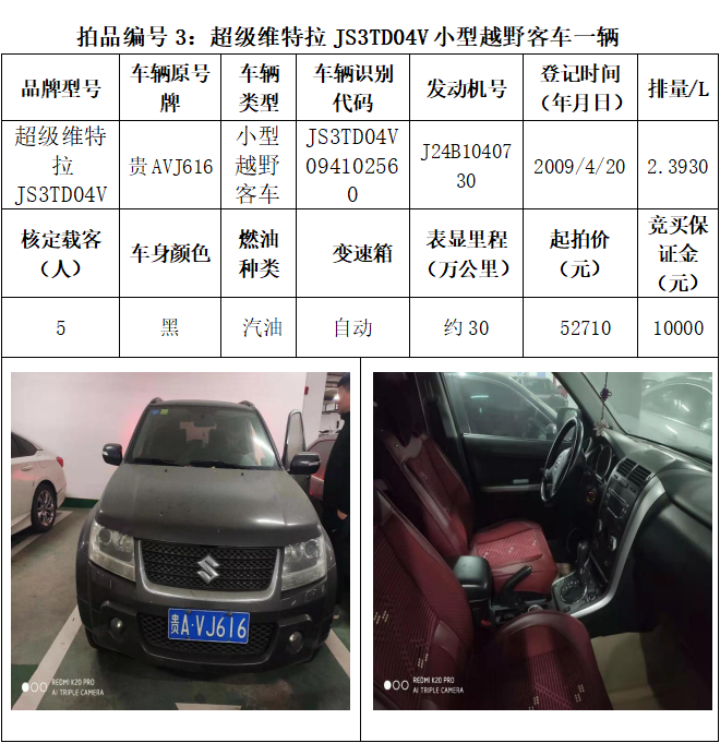 受委托,本公司定于2021年3月26日(星期五)下午14:30時(shí),在貴陽(yáng)市中華南路20號(hào)新大陸數(shù)碼廣場(chǎng)10樓D座拍賣(mài)廳公開(kāi)拍賣(mài)以下車輛:普拉多越野車1輛、超級(jí)維特拉越野車1輛、別克商務(wù)旅行車1輛、輝騰轎車1輛、途勝越野車1輛、雅閣轎車2輛、奧迪轎車1輛,長(zhǎng)城牌小型越野客車1輛,共計(jì)9輛車。