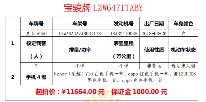 標(biāo)的一:GJA250寶駿牌730小型汽車一輛、honor(榮耀)V10白色手機一部、oppo紅色手機一部、MEIZUPRO6黑色手機一部,oppo白色手機一部。起拍價:11664.00元,保證金:1000.00元。