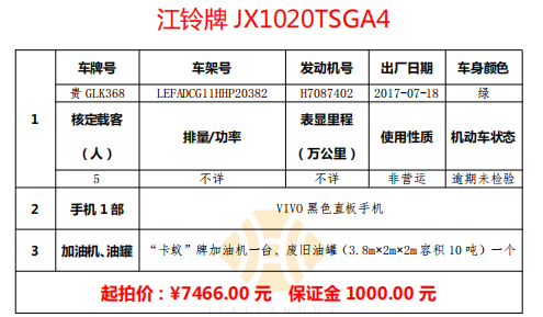 標(biāo)的二:GLK368 江鈴牌輕型貨車一輛、“卡蟻”牌加油機一臺、廢舊油罐(3.8m×2m×2m容積10噸)一個,VIVO黑色直板手機一部。起拍價:7466.00元,保證金:1000.00元。