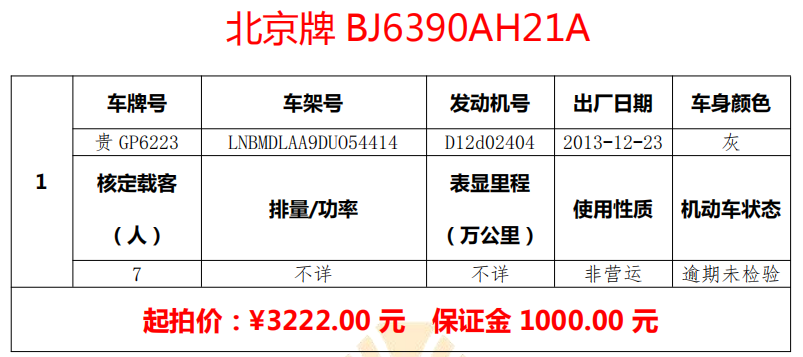 標(biāo)的三:GP6223北京牌小型面包車一輛。起拍價:3222.00元,保證金:1000.00元