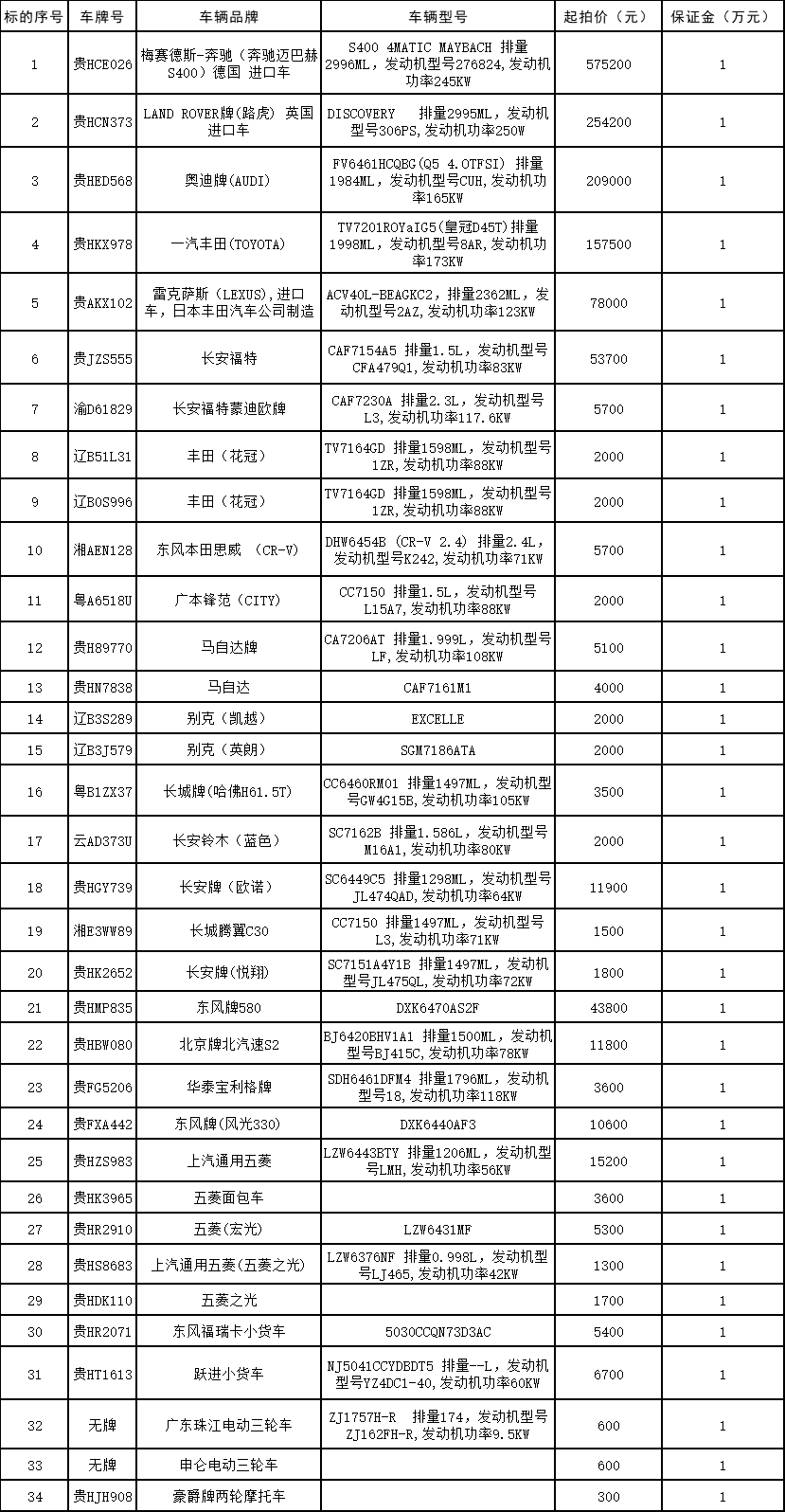 受委托,我公司將于2022年8月18日9:10在貴州省黔東南州公共資源交易中心及中拍平臺(tái)采用網(wǎng)絡(luò)與現(xiàn)場(chǎng)同步競(jìng)價(jià)方式公開(kāi)拍賣奔馳邁巴赫S400、路虎發(fā)現(xiàn)、奧迪Q5、皇冠、雷克薩斯等涉案車輛34輛(可憑裁定書(shū)自行辦理過(guò)戶)。